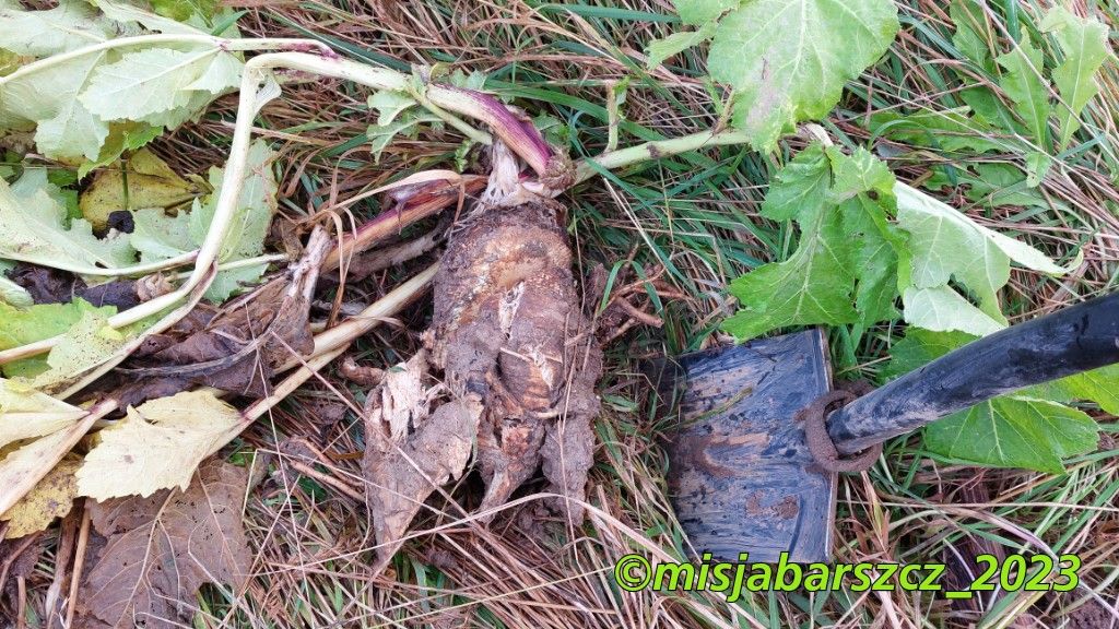 Korzeń tego niepozornego z zewnątrz okazu młodocianego barszczu Sosnowskiego osiągnął zdumiewającą wielkość (jak korzeń buraka cukrowego). W kolejnym sezonie bez wątpienia dałby początek ogromnej roślinie! Szczęśliwie wcześniej został zniszczony. Foto z końca października br.